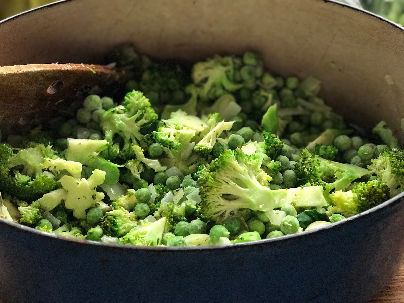 Add garlic and peas and broccoli.
